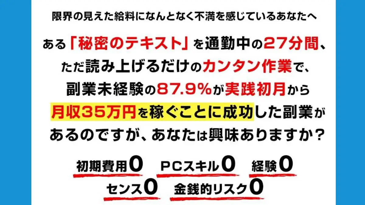 秘密のテキストを通勤中27分間だた読み上げるだけで月35万円とありますが